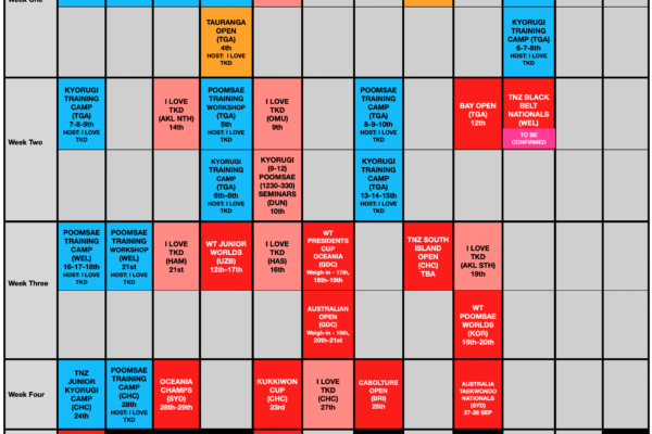 Here is the tournament calendar for Budo South taekwondo competitors 2025. It is a full calendar from April to September,…